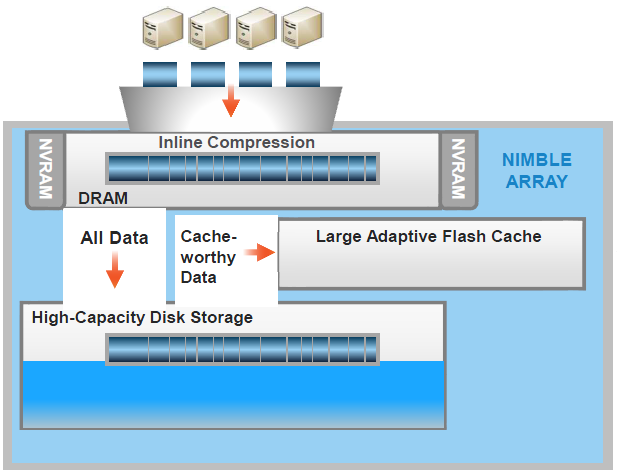 I ran into Nimble Storage a couple of years ago. A couple of guys came into my office (Jay and Eddie) and started to talk about how they have a product that can replace shelves of disk with only a 3U unit full of High Capacity SATA Drives, and 4 SSD Drives just used as a read Cache, plus give me WAN-Efficient Replication, 90 Days of Backup on Disk, Space efficient Snapshots, Compression (that increases performance) and High IOPs with low latency….. Ok thinking to myself these guys must have drank the Kool-Aid. Everything they say it can accomplish I WANT, can it really be true?