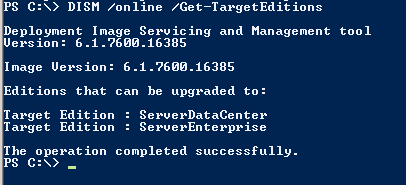 DISM /online /Get-TargetEditions” You can see from the output of the command window, Windows Server 2008 R2 Standard can be upgraded to Enterprise and DataCenter.